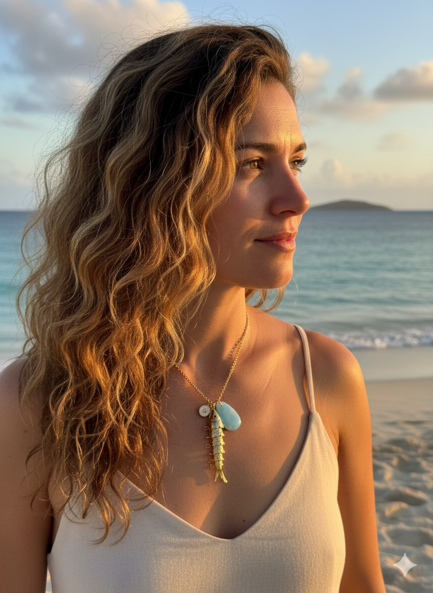 Colar Correntaria com pingentes banhados a ouro 18k tripla camada mais verniz protetor Diamond. Peça hipoalergênica em liga metálica sem nickel ou metais prejudiciais. Peça única com pingente sardinha, pedra Amazonita gota, mais pingente esmaltado com zircônia. Corrente 50cm. 12 meses de garantia e assistência permanente.
