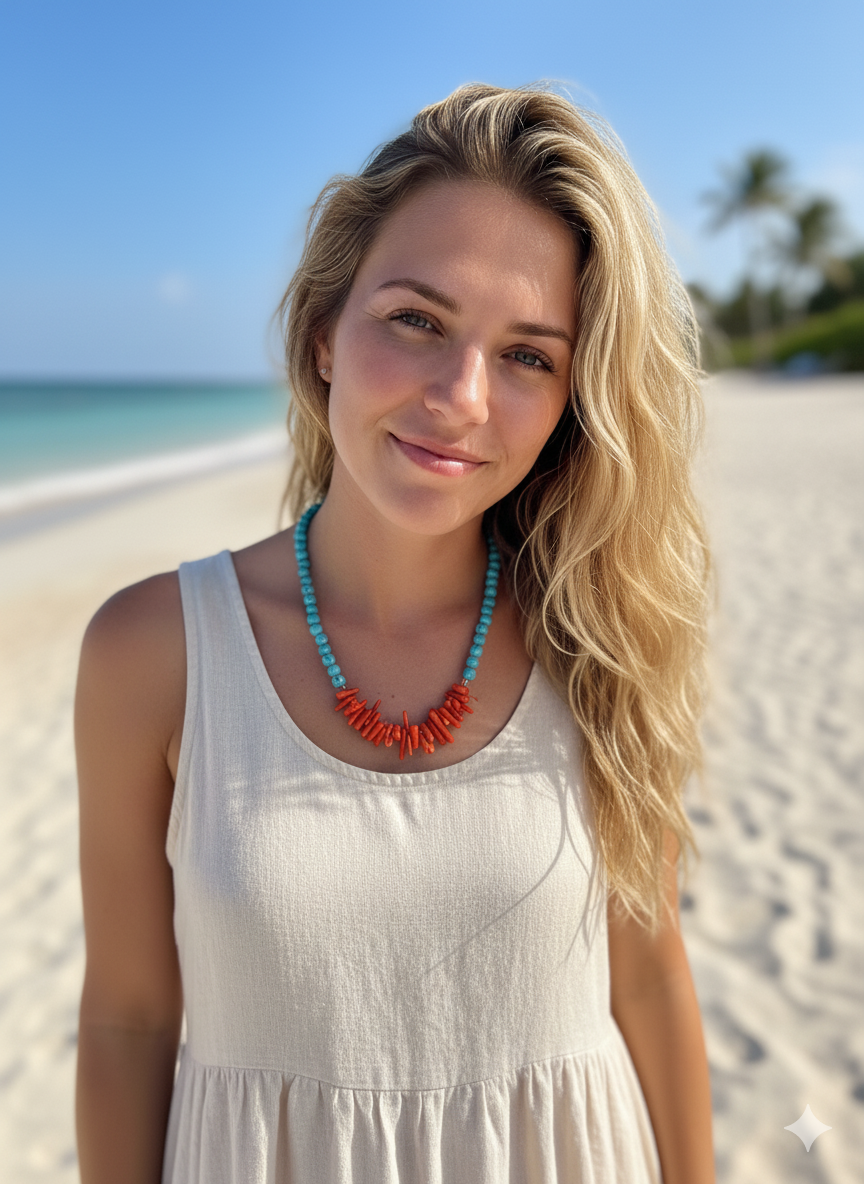 Inspirado nas paisagens paradisíacas e na energia vibrante dos dias ensolarados, este colar combina corais verdadeiros com a serenidade azul da turquesa e o brilho elegante das Hematitas.
